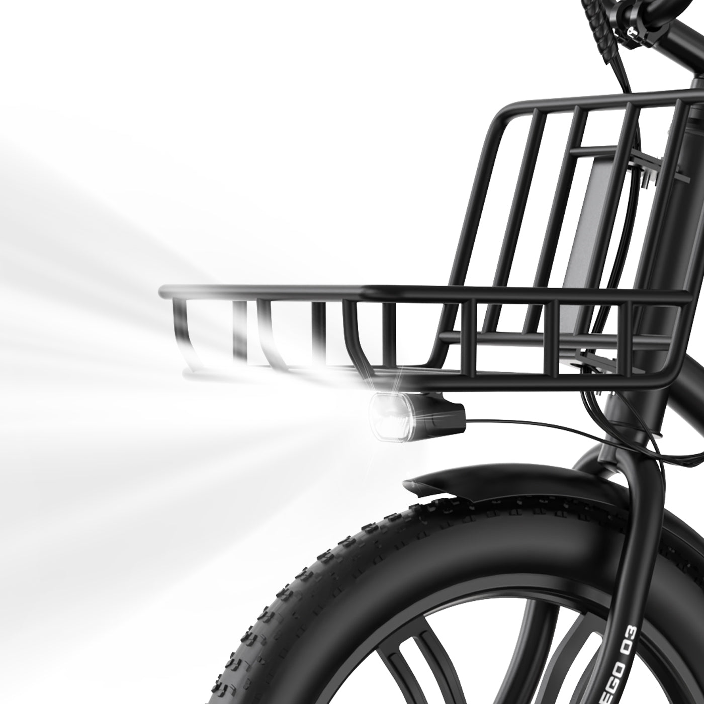The EGO03 also features a front basket, perfect for carrying smaller items, offering easy access and added convenience. Plus, its powerful front headlight ensures you can ride confidently even in low-light conditions, lighting up the path ahead for a safer journey.