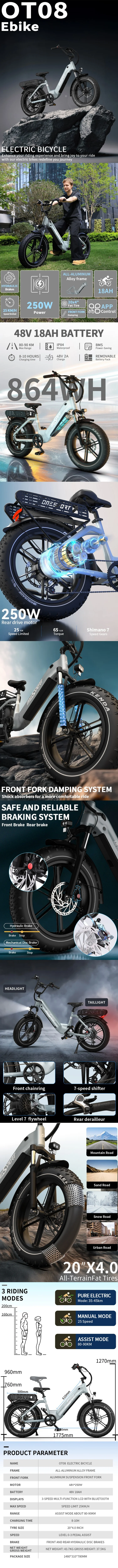 OneSport OT08 Elektriskais velosipēds, 20x4" Off-road, 250W, 48V 18Ah